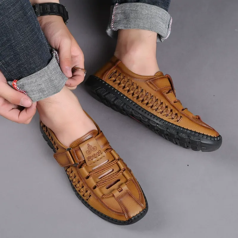 • New summer men's leather sandals with perforated and breathable clogs