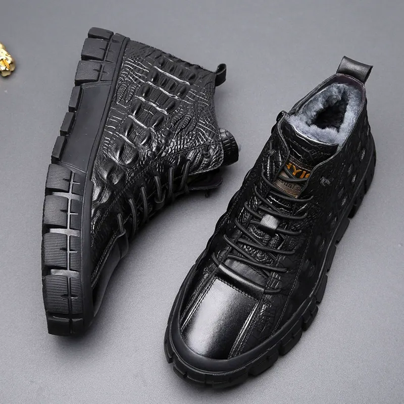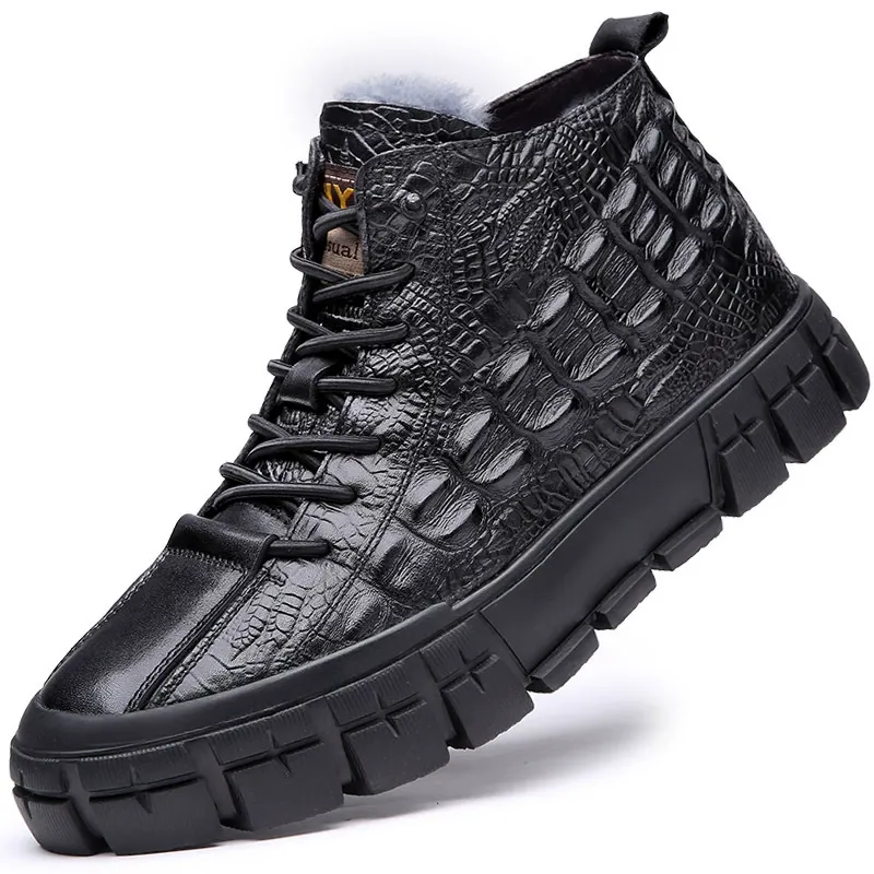 New winter men's cotton shoes, wool-lined, warm, embossed, stylish, and genuine leather.