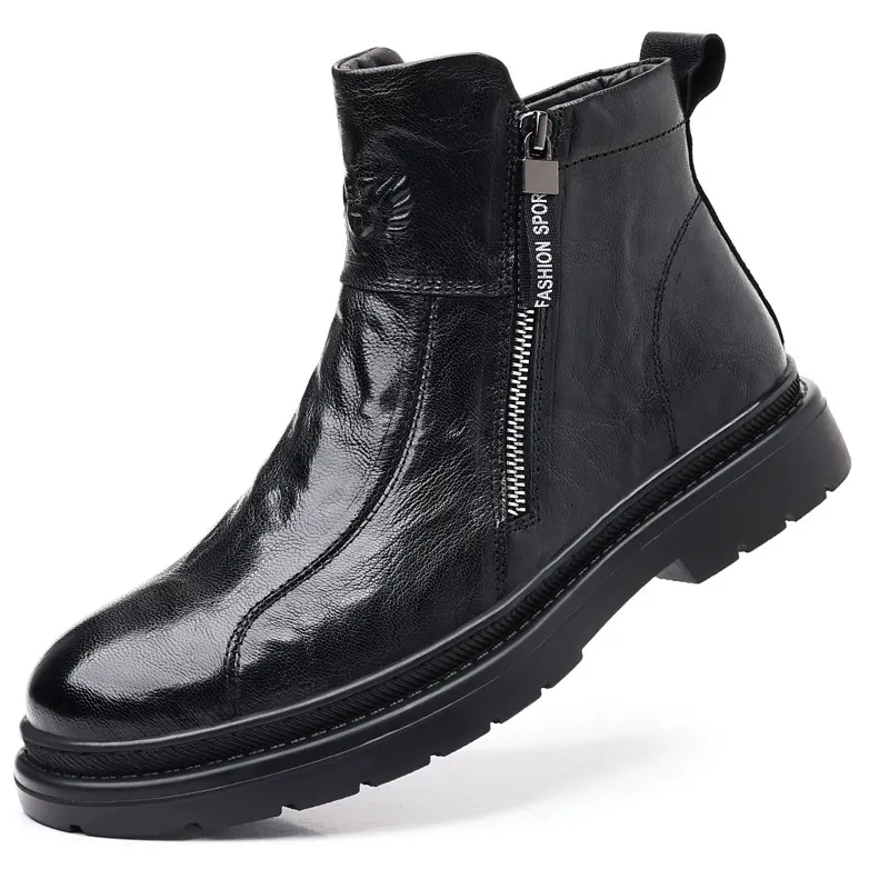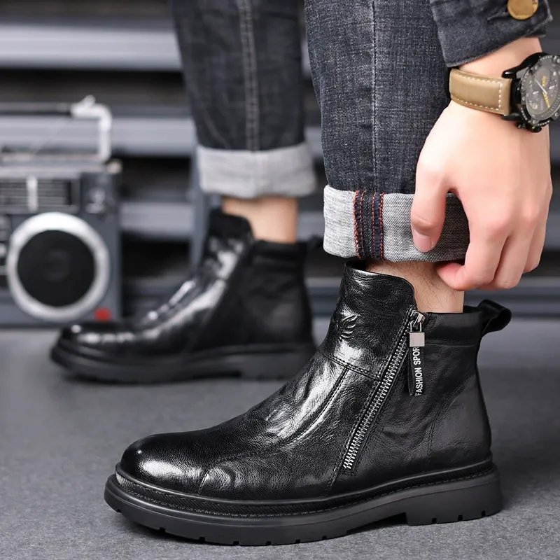 • Men's genuine leather high-top work boots, slip-on, fleece-lined, warm motorcycle boots.